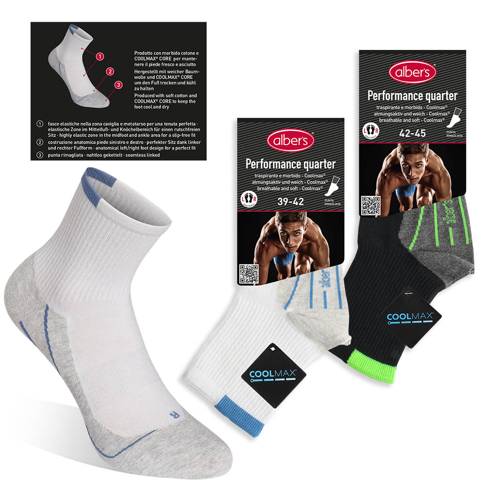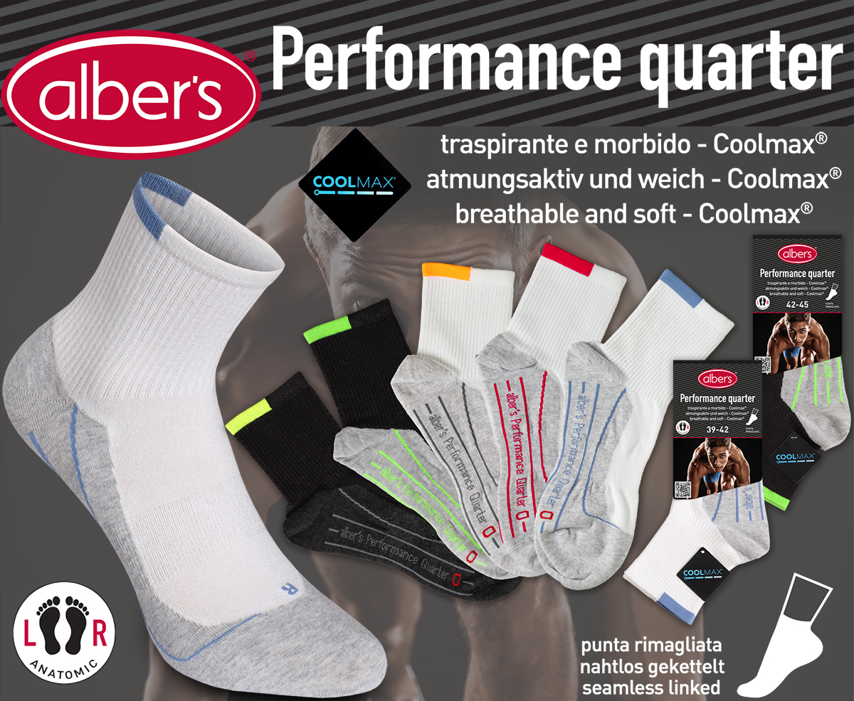 Calzino sport quarter performance con fasce elastiche nella zona caviglia e metà tarso per una tenuta perfetta. Costruzione anatomica piede sinistro e destro.